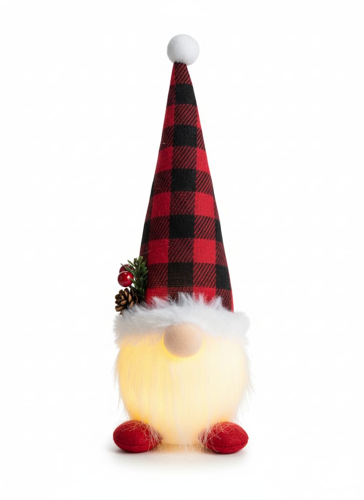 Yılbaşı dekorasyonuna renkli ve neşeli bir dokunuş! Ekose şapkalı mini cini, sevimli tasarımı ve pilli ışıklarıyla masalsı bir atmosfer yaratır. Masa, raf veya vitrinlerde kullanılabilir, dekorasyona eğlenceli bir detay ekler.